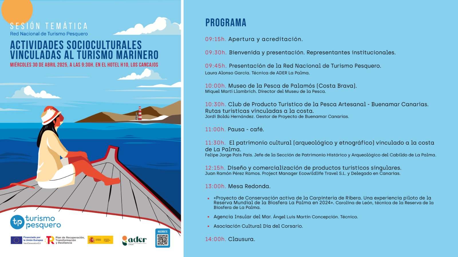 Durante la jornada, se presentará la Red Nacional de Turismo Pesquero de la mano de ADER La Palma, y se compartirán experiencias inspiradoras como la del Museo de la Pesca de Palamós (Costa Brava), a cargo de su director, Miquel Martí Llambrich. También se abordará el trabajo desarrollado por Buenamar Canarias en la creación de rutas turísticas ligadas a la pesca artesanal y el litoral, con la intervención de su gestor de proyecto, Jordi Boldú Hernández.